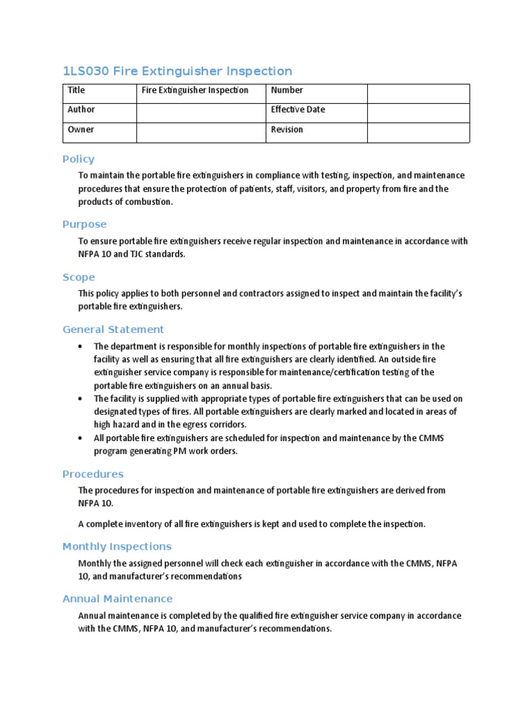 Uk fire extinguisher regulations recommend that fire extinguishers should be replaced every 5 years or given an extended service at that point. Visually check for the following items. If there is a fire extinguisher on site that does not pass the monthly inspection, please notify the utilities supervisor immediately. Mounted in an easily accessible place, no debris or material stacked in front of it. Periodic inspection of fire extinguishers shall include a check of at least the following items agents.